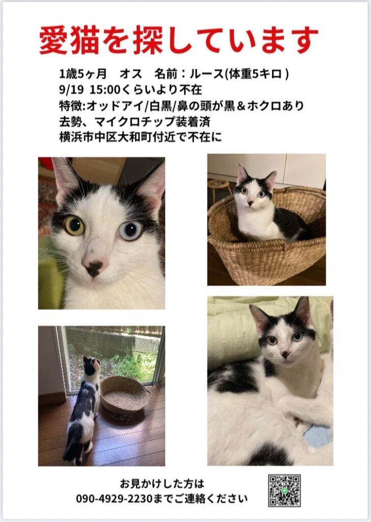 2025.09.20 2025.09.23 迷い猫を探しています! 日常 【📢迷い猫を探しています】 9月19日(金)の15時頃に迷子になってしまったそうです。 名前:ルースくん 年齢:1歳5ヶ月 特徴:白黒のオッドアイ 体重:5キロ マイクロチップ装着済み どんな些細な情報でも構いません。 見かけた方は、☎️045-629-1860までおかけください。 ご協力のほどよろしくお願いいたします。 【卒業アルバム】ビビちゃん 前の記事 【新メンバーのご紹介】セピくん・ダリくん・サフィくん 次の記事