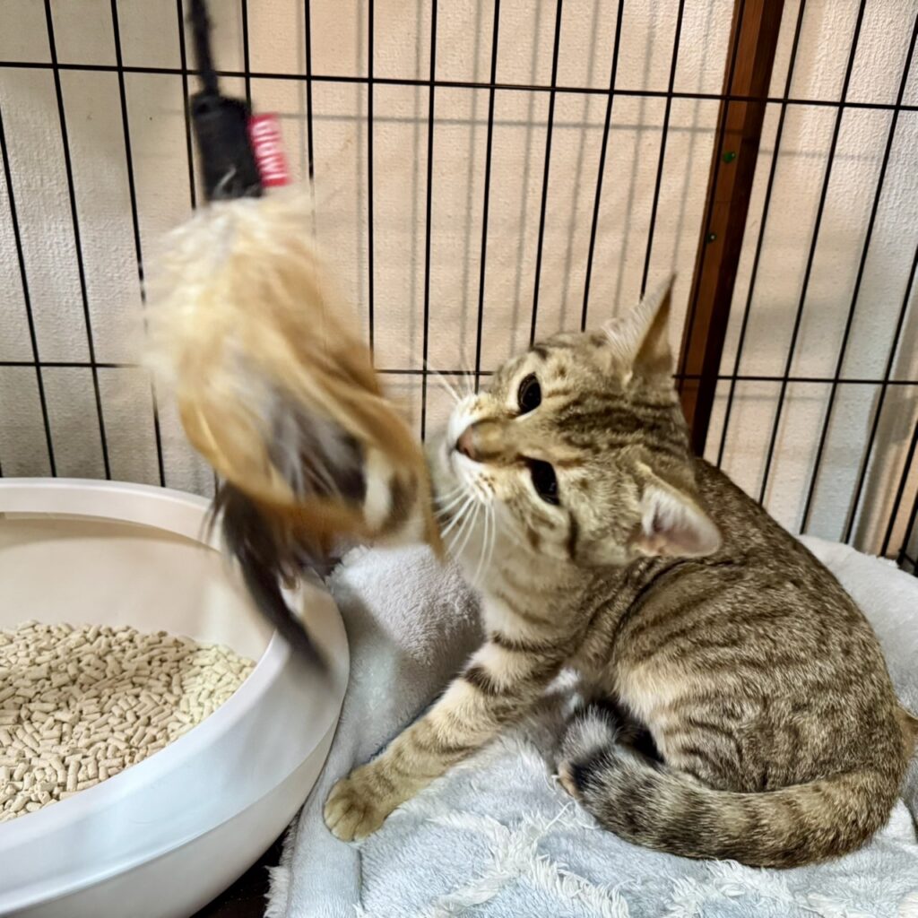 おもちゃを近づけると、最初は恐る恐る手を伸ばします🤭