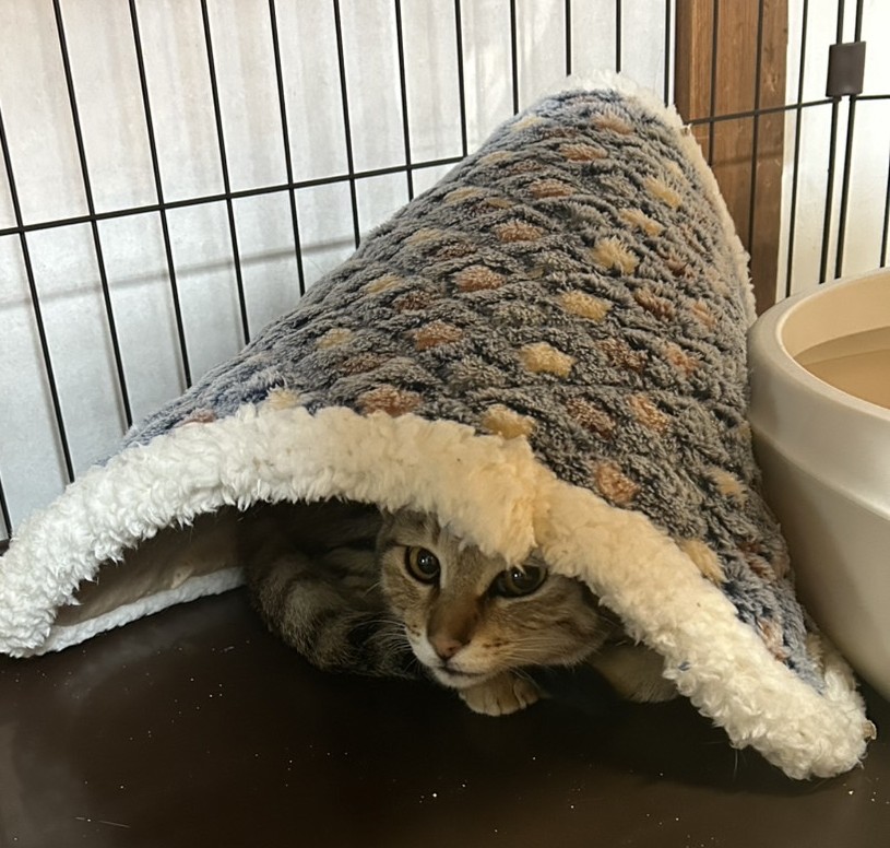 ハウスに来たばかりの時は、警戒心が強くクッションに隠れていましたが、