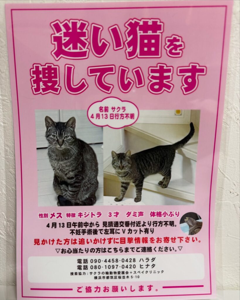 2025.04.27 迷子猫探しております! 日常 ⚠️迷子猫探しております⚠️ 4月13日の午前中から見晴通交番付近より行方不明となりました。 ※ハウスの猫さんではありません。 お名前:サクラ 性別:女の子 年齢:3才 毛色:キジトラ 【特徴】ダミ声、体格小ぶり 不妊手術は済んでおり、左耳にVカットがあります。 ※見かけた方は追いかけたりせずに、☎045-629-1860までおかけください。 些細な情報でも構いません。 ご協力のほど、よろしくお願いいたします! 【新メンバーのご紹介】トピちゃん・スイちゃん 前の記事 【譲渡決定】すみちゃん 次の記事